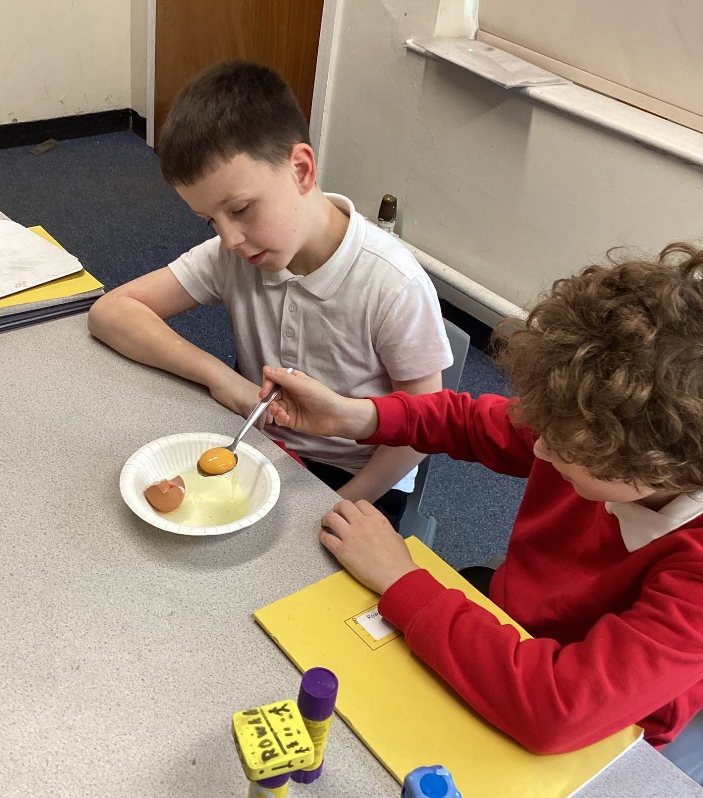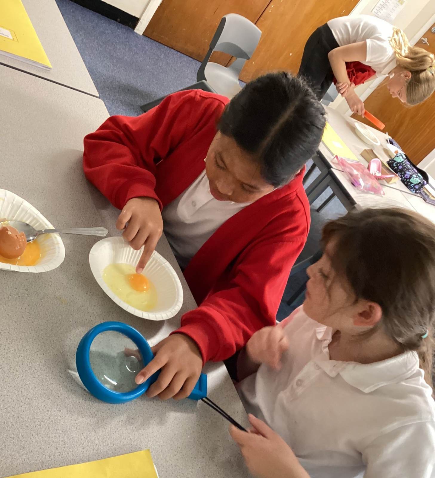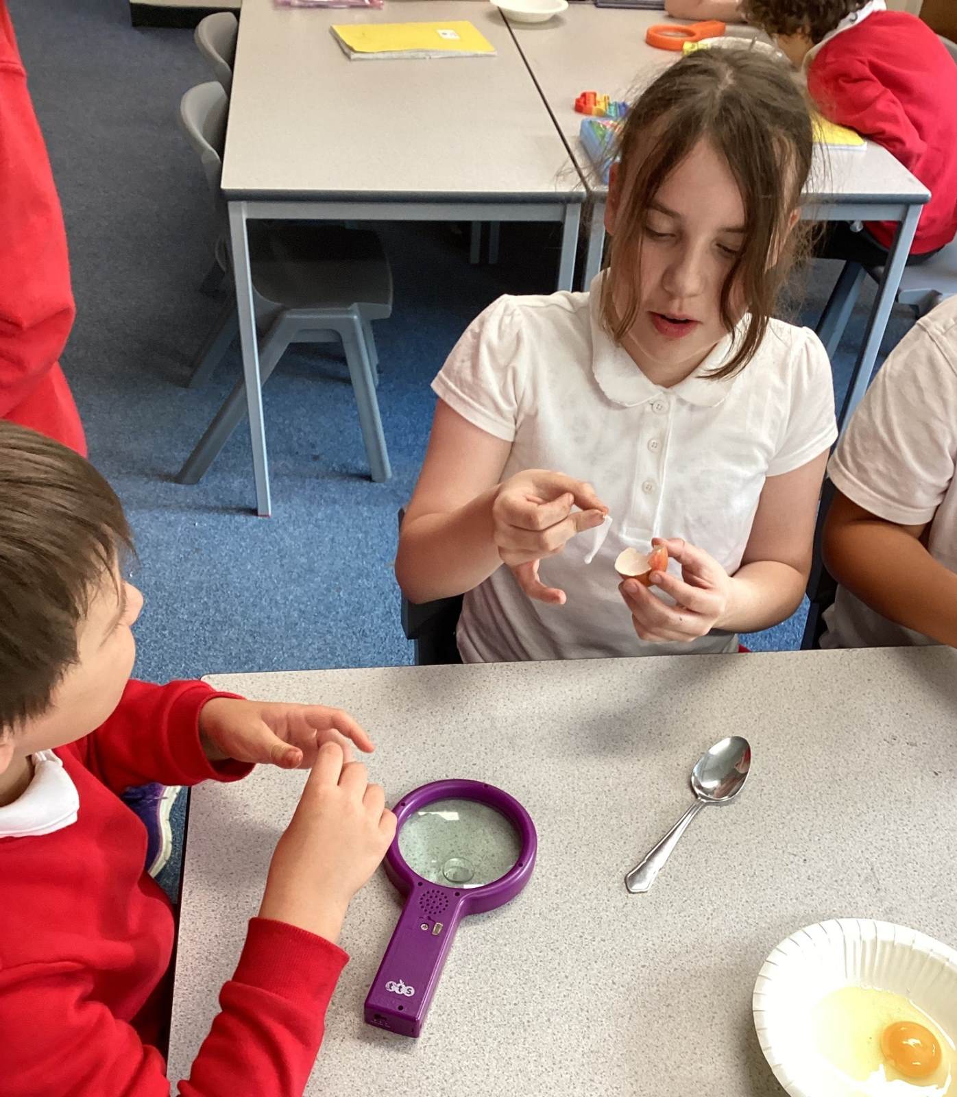 We then started to look at reproduction of animals, comparing the life cycles of many animal groups including birds, reptiles, amphibians, insects and the three different types of mammals. In our work on birds, we explored the parts that make up a chicken's egg. Children first used a magnifying glass to look closely at the shell before cracking them open to look at the inside. They each then drew and labelled a diagram of the egg, explaining the job of each part!