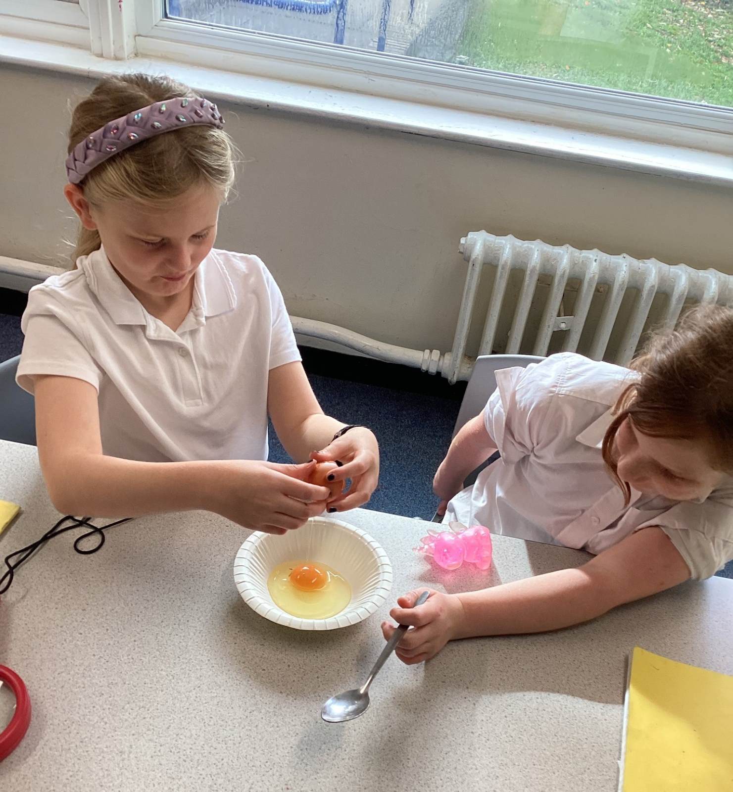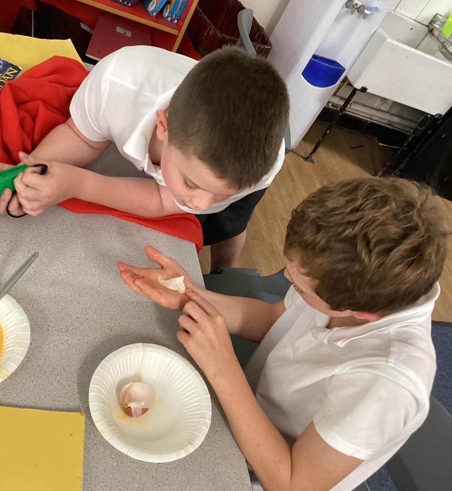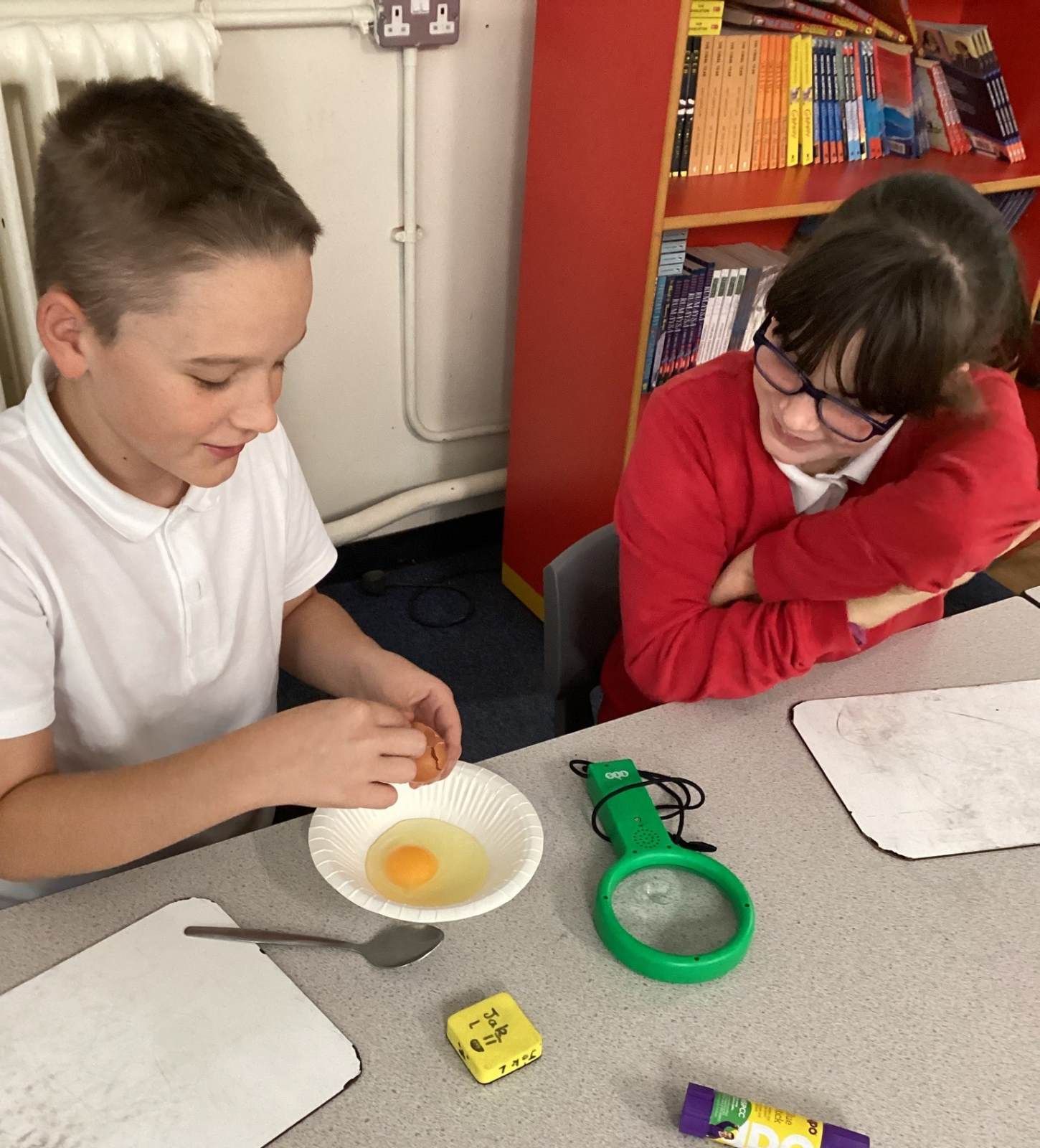 We then started to look at reproduction of animals, comparing the life cycles of many animal groups including birds, reptiles, amphibians, insects and the three different types of mammals. In our work on birds, we explored the parts that make up a chicken's egg. Children first used a magnifying glass to look closely at the shell before cracking them open to look at the inside. They each then drew and labelled a diagram of the egg, explaining the job of each part!